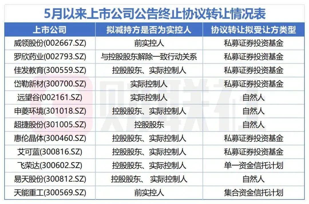 罕见!5月以来,已有12家A股公司公告主要股东终止协议转让,与今年前4个月的合计案例数相当,甚至占到了2023年以来此类案例总数的近四分之一。终止案例激增背后,似乎正酝酿着针对协议转让这一传统交易方式的秩序重构。据统计,近一年来,约有250家上市公司披露主要股东及董监高的协议转让减持计划(据Wind,首次公告口径统计),较此前12个月的公司家数略有增长。这表明,即使在股票市场并非特别活跃的当下,协议转让依旧在有序放行。其中,也出现了控股股东、实控人因上市公司破净、破发、分红不达标导致在二级市场减持受限,进而选择协议转让的案例。5月19日晚间,威领股份宣布终止协议转让,成为本月以来第12家公告终止协转的A股公司。上述协议转让扎堆被终止,主要的“关隘”可能是未获监管确认、股权过户未能完成。公告显示,受让方多数已向转让方支付了(部分)股权款,但股份过户却至今未能完成。对此,有头部投资机构人士透露,近阶段确有协议转让“严格把关”的消息,其中受到“特别关注”的,是那些与上市公司实控人套现有关的案例。(财联社)