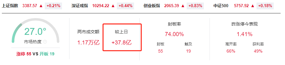 沪指小幅上涨0.21%、创指涨0.83% 电池概念全线走强 两市下跌个股超3600只。三大指数冲高回落集体收涨,截至收盘,沪指涨0.21%,深证成指涨0.44%,创业板指涨0.83%。北证50指数再创历史新高,创业板50指数涨超1%。两市个股跌多涨少,下跌个股超3600只;两市全天成交1.17万亿元,较上一日放量成交38亿元,内资主力资金净卖出301.6亿元;两市涨跌中位数为-0.66%。